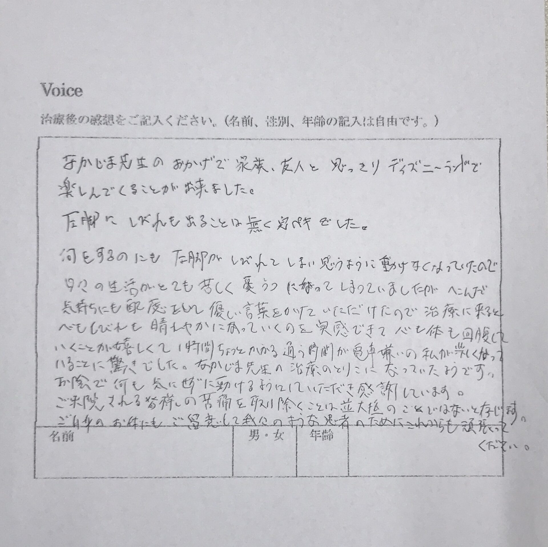 なかじま先生のおかげで家族、友人と思いっきりディズニーランドで楽しんでくることが出来ました。